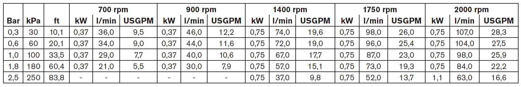 Trykk- og kapasitetsdata (basert på vann ved 20°C, helkam og neoprenimpeller):