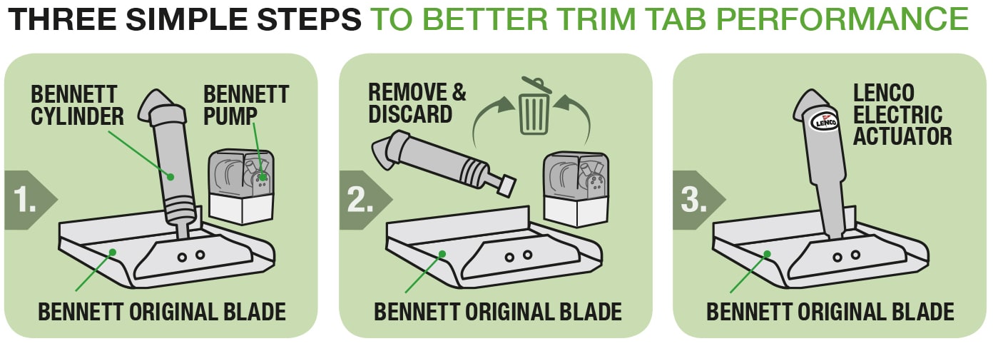 Dette Lenco-settet er laget for å direkte kunne erstatte dine gamle trimplan fra Bennett. Settet inneholder alt du trenger for å konvertere fra Bennett hydraulisk til Lenco elektrisk uten at man trenger og borre ett eneste hull.