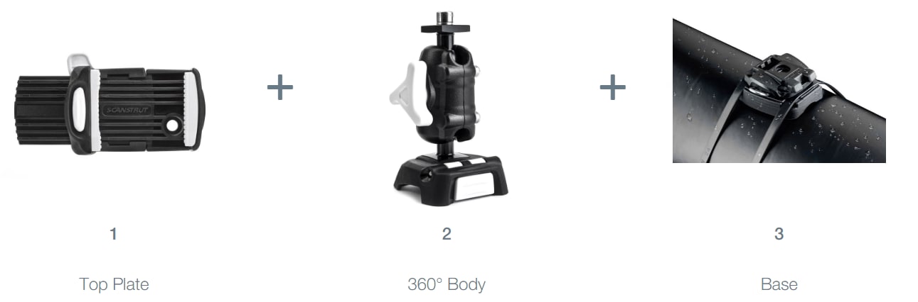 Systemet består av en topplate/mobilholder, en 360 graders dreibar brakett og en base med strips: