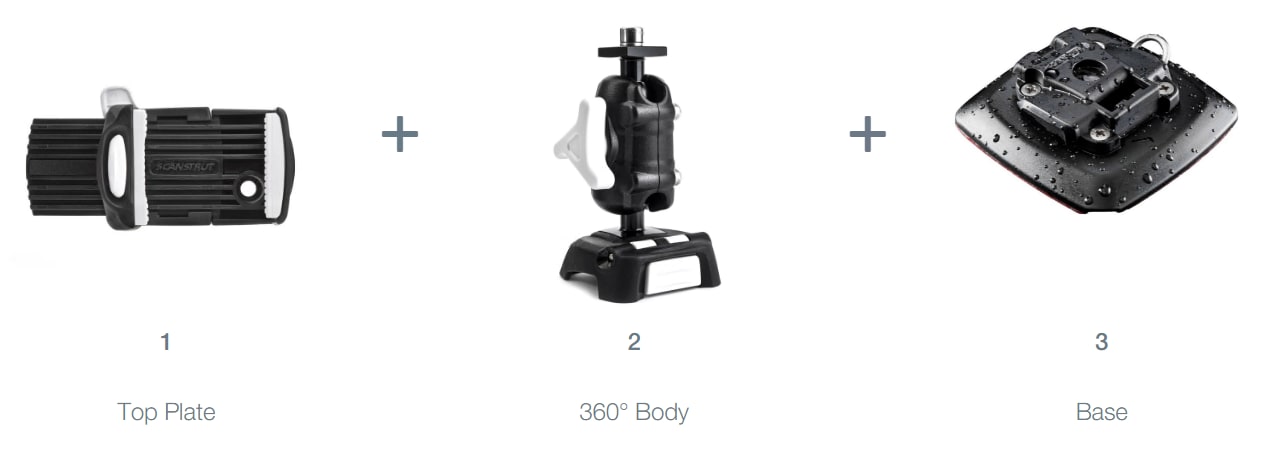 Systemet består av en topplate/mobilholder, en 360 graders dreibar brakett og en base med 3M selvklebende feste: